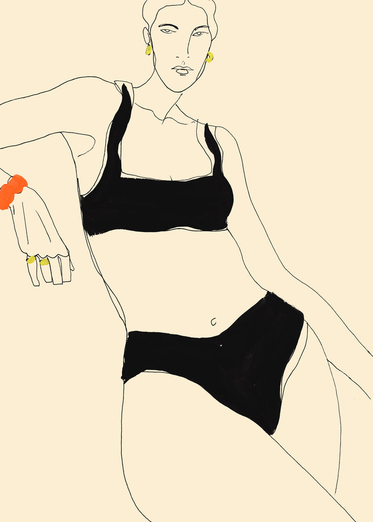Go for less coverage on the bottom, avoid reaching for a boy short or thick-banded bottoms – the extra fabric tends to highlight the very same area you are trying to play down.